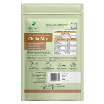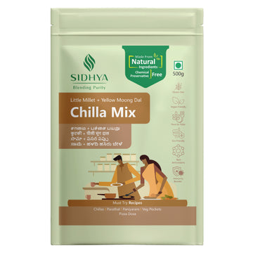 Sidhya Chilla Mix is your quick, wholesome solution for healthy meals on the go. Made with pure millets, pulses and natural ingredients, it is rich in protein, fiber, and nutrients to keep you energized throughout the day. Simple to prepare, preservative-free, and ready-to-cook, Sidhya Chilla Mix makes healthy eating easy without compromising on taste or nutrition.