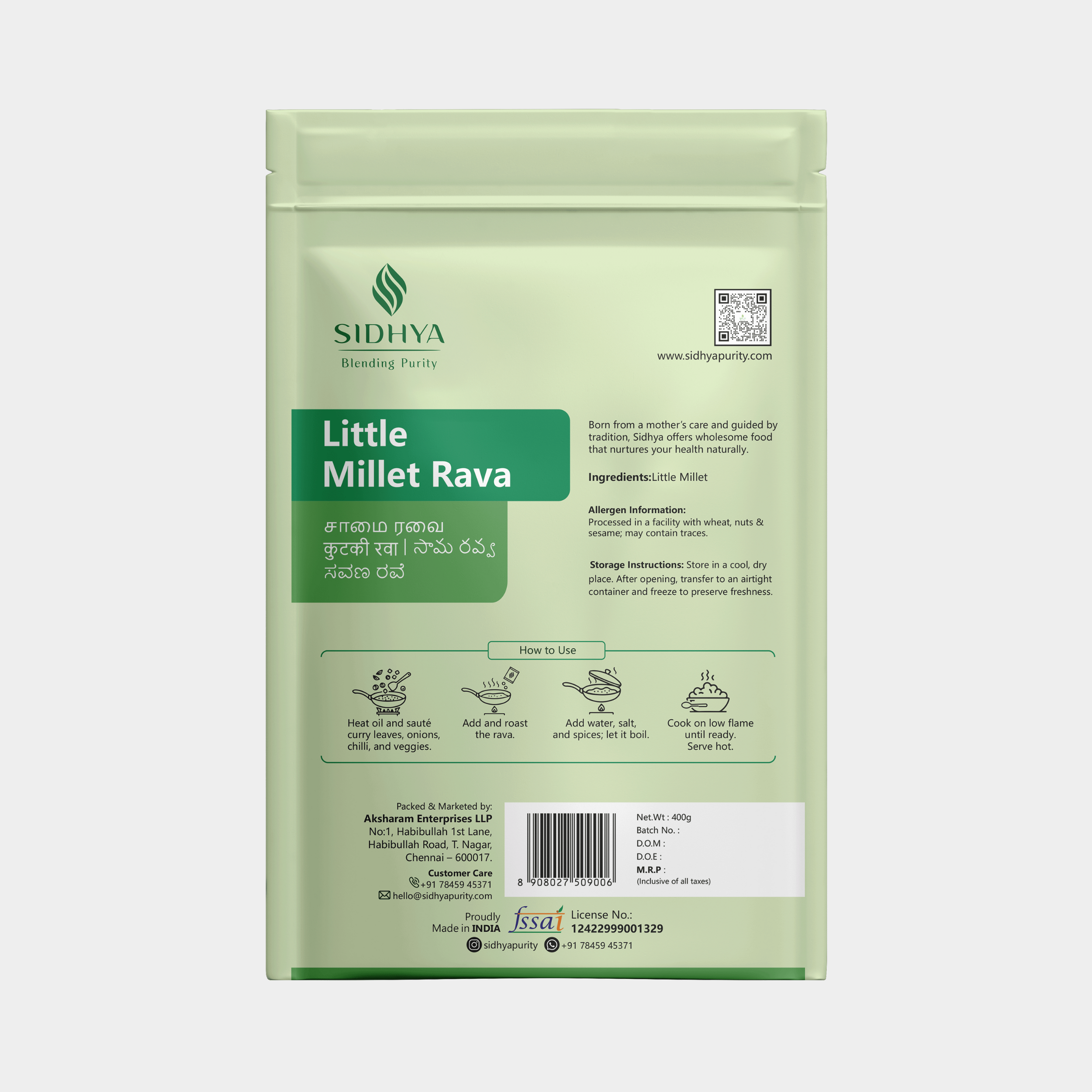 The Sidhya Way: We soak and sun-dry the millets before carefully processing them into rava. This ensures they remain unpolished, nutrient-rich, and naturally flavorful while cooking to perfection in every dish.