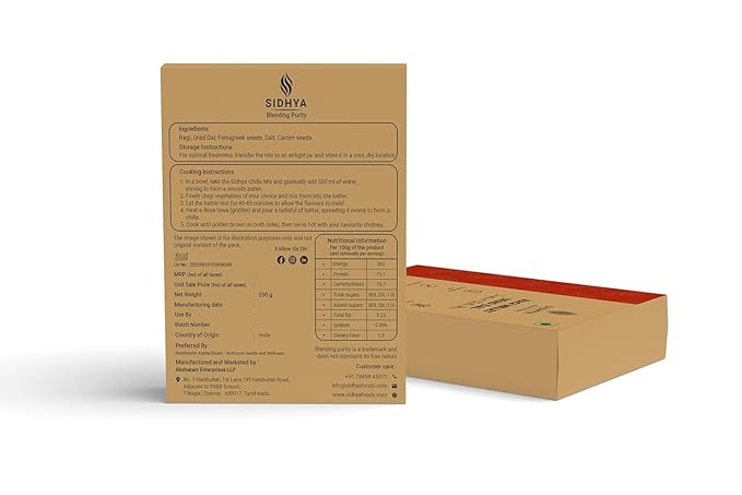 Sidhya Chilla Mix is your quick, wholesome solution for healthy meals on the go. Made with pure millets, pulses and natural ingredients, it is rich in protein, fiber, and nutrients to keep you energized throughout the day. Simple to prepare, preservative-free, and ready-to-cook, Sidhya Chilla Mix makes healthy eating easy without compromising on taste or nutrition.